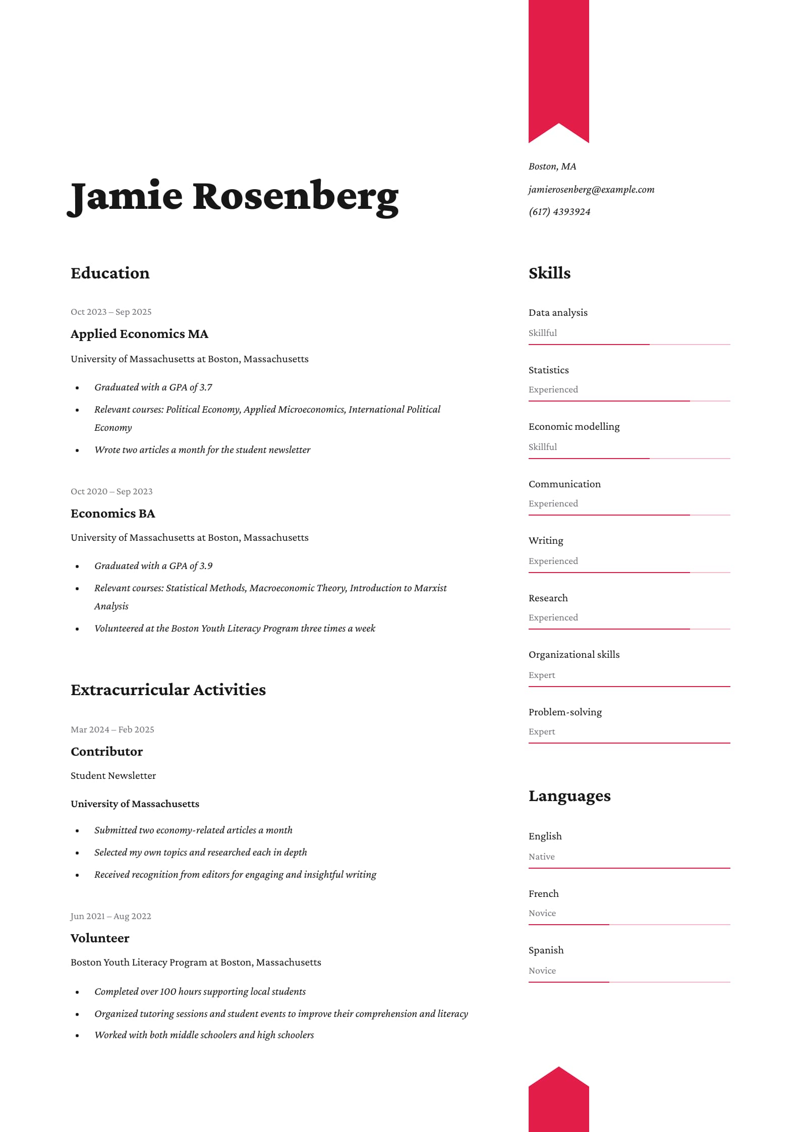Before we explore extracurricular activities in more detail, we’ll show you two resume examples containing these sections: a student's resume and an entry-level candidate's resume.