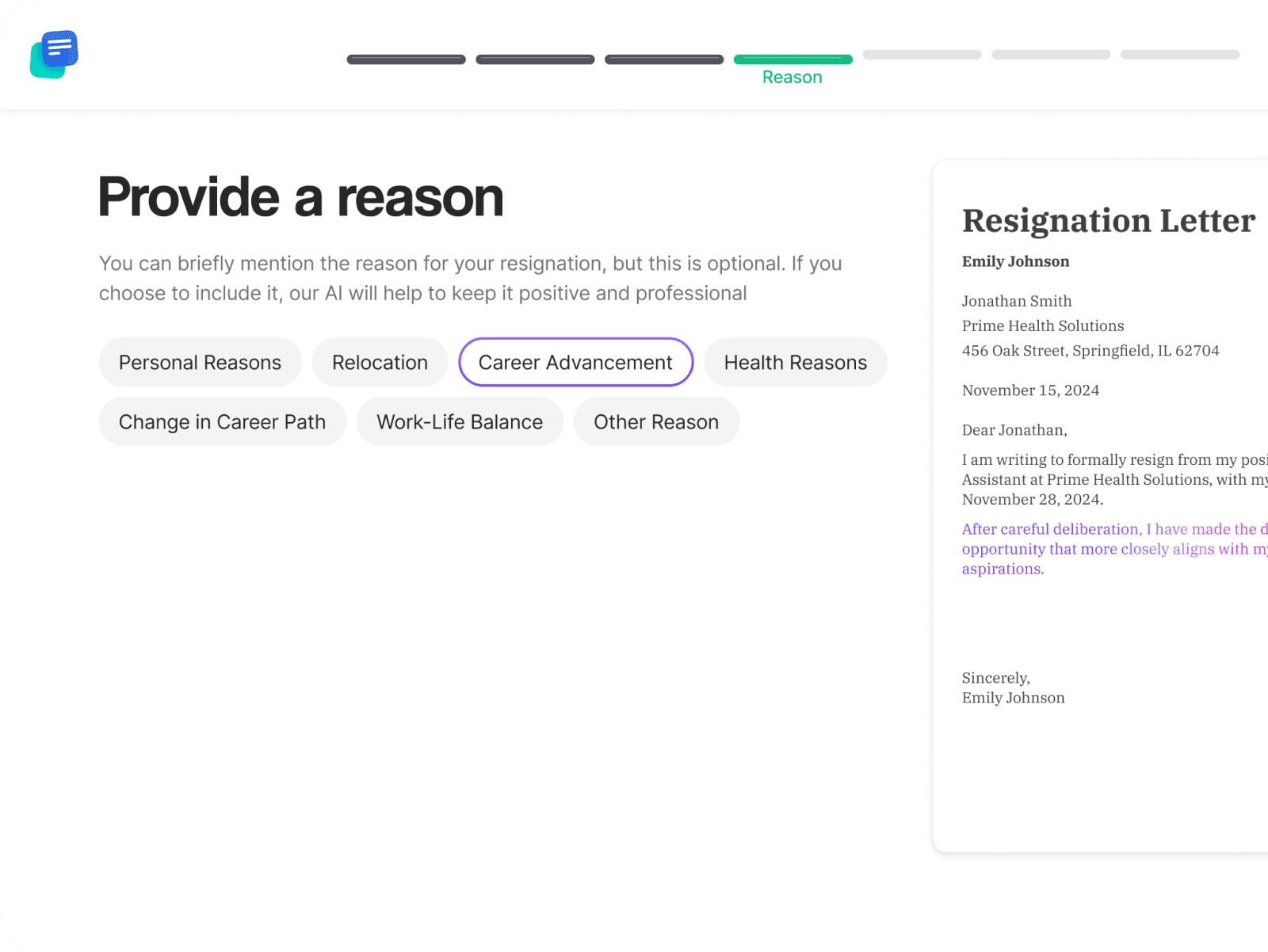 No matter the reason for leaving — whether it’s moving on to exciting opportunities, focusing on personal growth, or family reasons — our AI resignation letter tool will compose the perfect message.